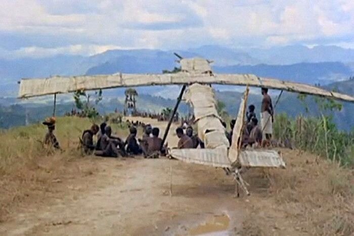 В прошлом веке на островах Тихого океана японцы и американцы проводили боевые действия в тех местах: строили военные базы и буквально закидывали острова грузами, которые спускались с неба на белых парашютах и шокировали не видевших ничего подобного туземцев. Солдаты заставляли, мягко говоря, пребывать в шоке местное население от того, что всё просто падает с неба. Логично ,что у аборигенов было довольно смутное представление о современном мире, потому объяснить себе это смогли только тем, что контейнеры в небе — это дары богов и духов. А американцы, по их мнению, просто научились использовать эти послания, которые на самом деле предназначались только местным жителям. Увлеченные религией подражательства, дикари практически перестали заниматься добычей пищи. Они просто предпочли вместо работы слепую веру в чудеса. После войны "пришельцы" попрощались с аборигенами и покинули острова. Вместе с этим прекратились и послания небес. Но! Туземцы же не лыком шиты ,и решили они значит повторять