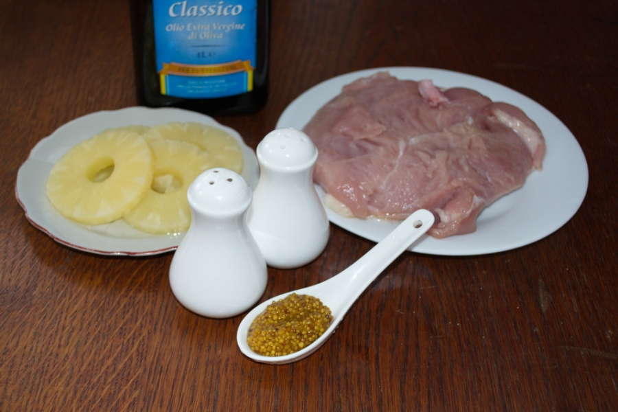 Для приготовления нам понадобятся такие ингредиенты: Несколько кусочков курицы (можно использовать бедра или грудинку), Сыр твёрдый - 200 грам, Майонез, ананас консервированный кружёчками, соль, черный перец и другие специи по- вкусу. Приступаем к готовке: 1. Мясо разрезаем на средние по толщине кусочки ( если это бедро, то сначала необходимо удалить косточки), слегка солим, посыпаем специями, добавляем немного майонеза, ставим на час пропитатся в холодильник. 2. Нам необходимо подготовить сыр, для этого натераем его на тёрку. 3. Смазываем противень растительным маслом для того что бы мясо не прилипло во время запекания.Раскладываем кусочки мяса на противень, но так что бы оно было не слишком близкодруг к другу. На каждый кусочек мяса — по колечку ананаса. 4. Сверху на ананасы сыпем тертый сыр, так что бы пропусков небыло .При желании сверху можна добавить немного майонеза. 5. Помещаем наш противень в духовку разогретую до 180 градусов на 30-40 минут. 6. Когда курица приготовится, до
