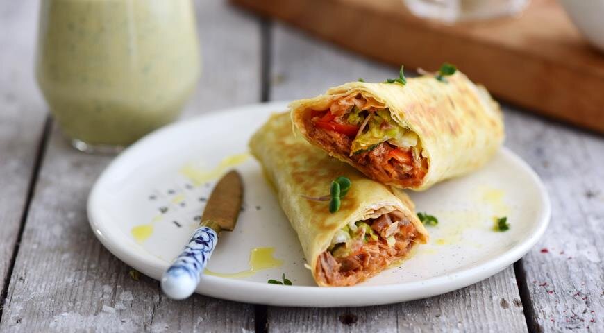 К роллам можно сделать холодный пряный напиток на основе кефира или йогурта с огурцами, укропом и специями (паприка, имбирь, зира, кориандр, соль, перец), взбив их вместе в блендере до однородности. ИНГРЕДИЕНТЫ ПОШАГОВЫЙ РЕЦЕПТ ПРИГОТОВЛЕНИЯ Шаг 1 Нарежьте грудинку тонкими ломтиками, затем небольшими кубиками. Щедро заправьте соусом барбекю. Шаг 2 Огурец очистите от кожуры и нарежьте тонкими кружочками. Посолите и поперчите. Сладкий перец очистите от семян и перегородок, нарежьте тонкой соломкой. Нашинкуйте айсберг. Шаг 3 Выложите на один край лепешки ряд мяса, затем ряд сладкого перца, закройте часть лепешки огурцами, посыпьте айсбергом, полейте оливковым маслом. Разделите подготовленные продукты каждый на 4 части. Шаг 4 Сверните тугой ролл, подвернув открытые края. Так же приготовьте остальные роллы. Эти роллы можно есть холодными, но можно и обжарить на сковороде-гриль.