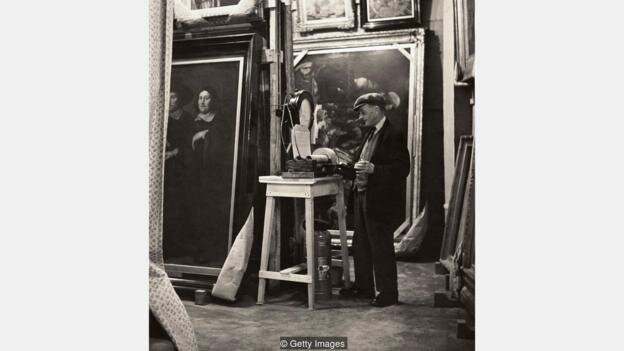 Во время Второй мировой войны большая часть искусства была разрушена в бою или разграблена, и ее больше не видели. И хотя многое было спасено благодаря героическим усилиям отдельных лиц и учреждений, некоторые из рассказов об искусстве в военное время заставляют нас вздрагивать. В Париже Лувр был опустошен в 1939 году, и 3600 картин были отправлены в безопасные дома. Мона Лиза - теперь считавшаяся слишком хрупкой, чтобы ее тронуть - пять раз переправлялась по стране, переходя от замка в замок, чтобы стать дальше на шаг от нацистов. Хранители учитывали уровень влажности комнаты, где хранятся картины - многие методы, используемые для сохранения искусства, были разработаны в Manod (Credit: Getty Images) В Британии Национальная галерея была не единственным учреждением, которое переехало в Уэльс: Британский музей отправил Великую хартию, работы Микеланджело, Рафаэля и Леонардо да Винчи, а также редкие книги, в том числе Шекспира и Мильтона, в Национальную библиотеку Уэльса в Аберистуйте ,