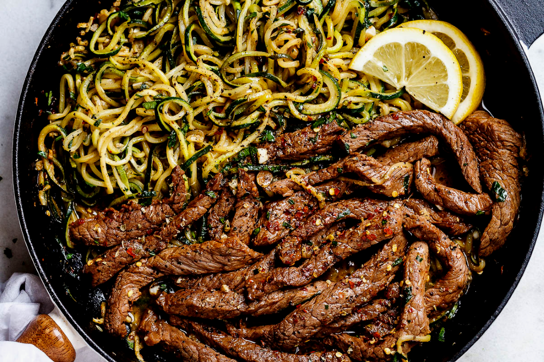 Порадуйте себя и своих близких оригинальным рецептом с лимонно - сливочным соусом, чесноком, лапшой, цукини и мясом. Мясо, лапша из цукини и соус готовятся вместе в одной кастрюле для быстрого приготовления. Таким образом блюдо получается низкокалорийным. Маринад используемый для мяса помогает размягчить мясо и наполнить его особенным вкусом. Ингредиенты Для маринада Приготовление 1. Объедините ингредиенты для маринада в герметичном контейнере или сумке Ziploc. Добавьте мясные полоски в маринад, запечатывайте и оставьте мариновать в холодильнике в течение 30 минут до одного часа. 2. Тем временем помойте и обрежьте концы цуккини. Используя терку, сделайте лапшу цуккини, затем отложите ее. 3. После мариновки доведите мясо к комнатной температуре и нагрейте масло в большой сковороде по средней высокой температуре - сок маринада пока отложите. Добавьте мясные полоски в один слой на скороводу и приправьте солью и перцем. Готовьте в течение одной минуты, не помешивая. 4. Добавьте измельч
