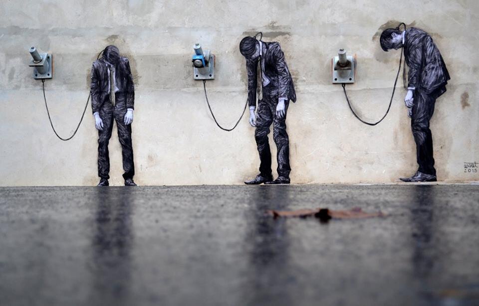 Мы можем увидеть, как бронзовый бык внезапно превращается в минотавра, а дряхлый угол переулка становится местом для страусов. Если какой-либо из этих странных рисунков покажется знакомым вам, вы, вероятно, живете в Париже и были свидетелями работ французского художника Шарля Леван. Судя по названию Levalet, художник вводит юмор на улицы Парижа путем склеивания животных и человека на стенах. Французский уличный стрит арт с юмором