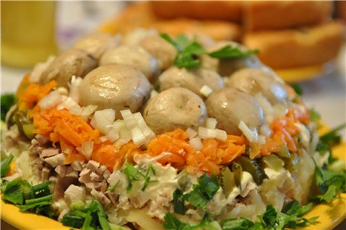 Сегодня я расскажу, как правильно сделать этот салат. Ингредиенты: сырки плавленые 2 шт морковь вареная 2 шт огурцы маринованные 2 шт свинина отварная 200 г шампиньоны цельные маринованные 1 банка картофель отварной 2 шт лук репчатый 1 шт яйца вареные 3 шт майонез 1.Салат укладываем слоями. 2.Глубокую большую салатницу смазать растительным маслом 3. Шляпками вниз уложить грибы, чтобы заполнилось все дно салатницы 4. Лук (лук заранее порезать полукольцами, замариновать в уксусе пополам с водой и после отжать), полить майонезом. 5. Слой моркови (морковь на крупную терку), затем маринованные огурцы (порезать тонкими кружочками), полить слой майонезом. 6. Выложить слой рубленого мяса 7. Cнова майонез 8. Далее плавленый сырок (на терку), майонез, картофель (на терку), майонез, яйца (мелко порубить), майонез. 9. Салат убрать на 12 часов в холодильник.