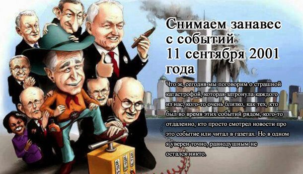 Официальная версия терактов 11 сентября 2001 года противоречит здравому смыслу, элементарным основам школьного курса физики и даже фотографиям и видео самих терактов в Нью-Йорке и Вашингтоне. Все эти факты, логика и основы физики доказывают, что террористическая махинация 11 сентября 2001 года была организована антинародным правительством США, которое виновно в гибели нескольких тысяч американцев в Нью-Йорке, Вашингтоне и Пенсильвании. Так что истинные виновники террористической фальсификации 11 сентября еще пока не наказаны. Очевидно, что эта фальсификация поддерживается лишь тем, что ЦРУ запретило журналистам американских СМИ говорить правду Америке под страхом увольнения (а может быть и чего похлеще). Просто американские СМИ строят в США самый настоящий коммунизм, но только не с помощью революции, как в России, а с помощью постепенного гниения.