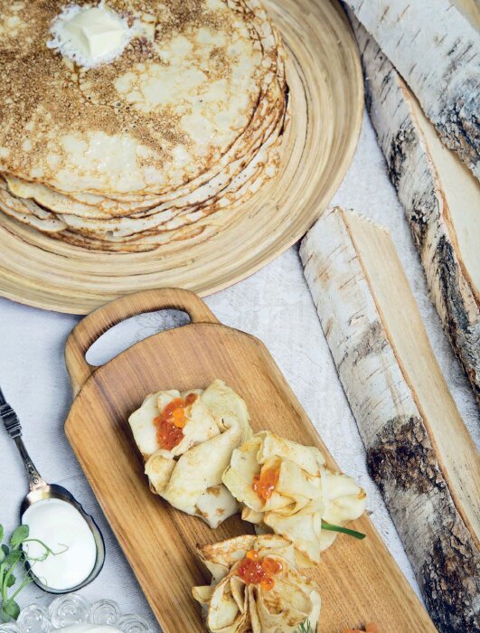 сахарная пудра Приготовление: 1. Молоко смешиваем с кефиром и подогреваем до теплого состояния 40-50 C. 2. Отделяем яичные белки от желтков. 3. В смесь молока и кефира добавляем желтки, соль, сахар, соду, гашенную лимонным соком, и растительное масло. 4. Постепенно вводим муку и тщательно перемешиваем до однородной массы. 5. Белки с добавлением соли взбиваем в крепкую пену и аккуратно вмешиваем в тесто. Такой способ добавления белков сделает ваши блины более румяными, пышными и ажурными. 6. Выпекаем блины на хорошо разогретой блинной сковороде, смазанной растительным маслом. 7. Соленая подача. Подаем по желанию- кому с чем. Хочешь со сметаной, хочешь с семгой. Кому-то, может, с птичьим паштетом, а кому-то с икрой. 8. Сладкая подача: Для сластен блины можно подать с жидким