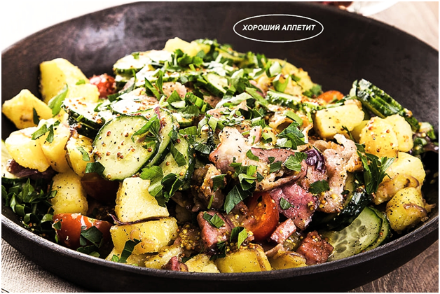 Конечно, он не совсем ПП, а точнее вообще не ПП. Но я попробовала заменить мясо на куриную грудку, и получается так же вкусно!!! Берите себе на заметку и пользуйтесь! Ваши мужчины точно оценят. ИНГРЕДИЕНТЫ 1ШТ – Красный лук 15ГР – Дижонской горчицы 15ГР – Белого рисового уксуса 10ШТ – Красных свежих томатов черри 5ГР - Свежей петрушки и зелень 30ГР – Зернистой горчицы 4 СТ. Л – Оливкового масла 20мл - Воды 1 - Зубчик чеснока 200ГР – Свежих огурцов 100ГР – Бекона 100ГР – Сырокопченой грудинки 500ГР – Свежего картофеля ПРИГОТОВЛЕНИЕ 1. Очистите картофель и нарежьте его кружками толщиной в 1 см. После положите его в кипящую подсоленную воду и варите в течение 20 минут. Слейте воду, остудите картофель и нарежьте его крупными кубиками, размером 1,5х 1,5см. 2. Бекон нарежьте крупными кубиками 2х2 см. 3. Грудинку также нарежьте кубиками только 1х1 см. 4. Помидоры черри разрежьте пополам. 5. Огурцы нужно нарезать кружочками. 6. Красный лук очистите, и нарежьте полукольцами. 7. Далее влейте в