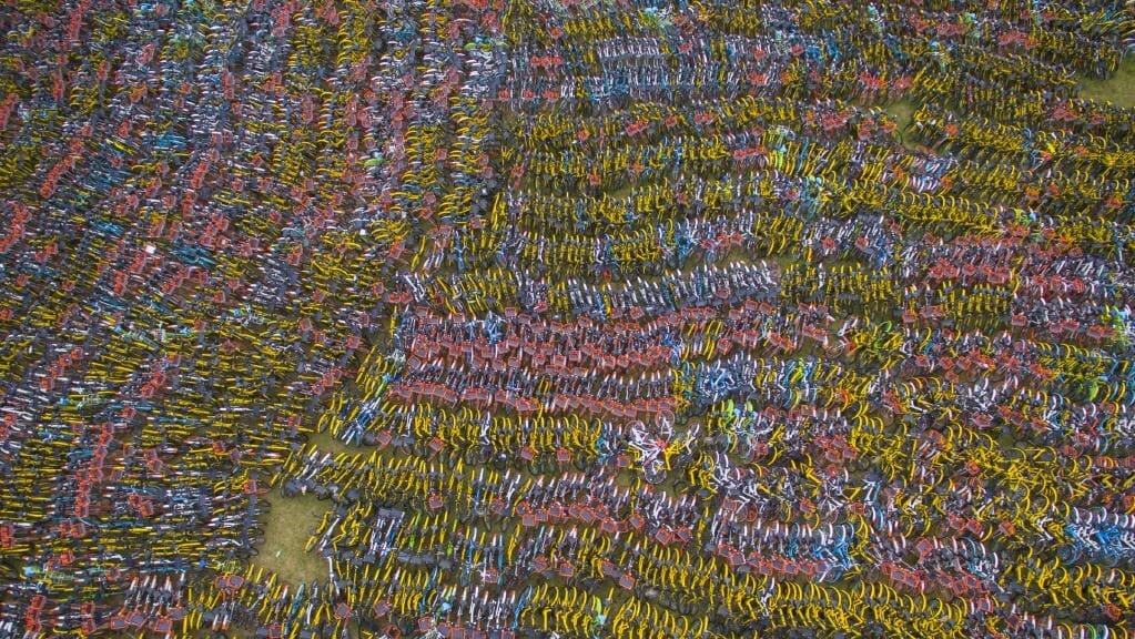 Невероятные фотографии рассказывают печальную историю о «велосипедных кладбищах Китая». НЕТ, это не произведение искусства. Вы смотрите на «велосипедное кладбище» на окраине Ханчжоу, Китай. Головокружительные фотографии, сделанные над кладбищем, показывают тысячи отличных велосипедов, оставшихся ржаветь в пустом поле за пределами оживленного города. Нелюбимые велосипеды были изъяты полицией после того, как популярная правительственная программа обмена велосипедами была захвачена частными техническими компаниями. Обычно совместное использование велосипедов - благо для экосознательных городов, но для Ханчжоу, население 9 миллионов человек, концепция создала больше проблем, чем она решила. Это была прекрасная велосипедная езда, когда город впервые запустил свою программу стоимостью 24 миллиона долларов в 2008 году для сокращения загрязнения воздуха. Местные жители оставляют машину дома, забирают свой бесплатный велосипед, катаются до места назначения и оставляют его в одной из 3000 назн