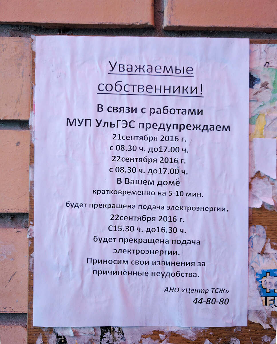 Две недели назад у входа в подъезд повесили объявление: Каждый день я ворчал: «Ну кто так пишет?». Потом подумал: ты ж редактор, — возьми и перепиши, раз такой умный. Оказалось, все не так просто. Я переписывал объявление три часа. Составил шпаргалку, чтобы в следующий раз было проще. Разберемся, что здесь не так Бессмысленный заголовок. Хороший заголовок привлекает внимание и подсказывает, о чем пойдет речь в тексте. Это особенно важно, когда мы имеем дело с неподготовленным читателем, который не собирался читать наш текст. Чтобы привлечь внимание и сэкономить время читателя, вынесем в заголовок главное — что и когда произойдет: Каша из повторов. Важно рассказать, как долго не будет света. Тут все непросто: в оба дня свет отключат на пять минут, а 22 сентября — еще и на час. Сейчас даты дублируются друг под другом, читать их сложно. Объединим их в одном абзаце и вынесем в начало текста: Неубедительные извинения. «Приносим извинения за неудобства» — это отстой. Когда отключают свет — э