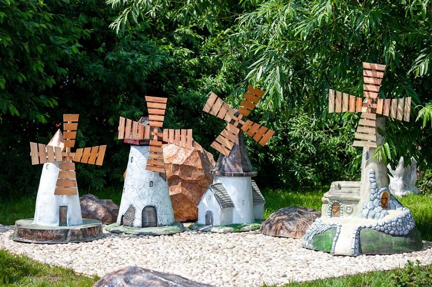 При оформлении ландшафта приусадебного участка нередко используются экзотические растения и малые архитектурные формы. Немаловажную роль играют всевозможные элементы и предметы декора. Колоритным украшением ландшафта являются мельницы садовые, пользующиеся всё большей популярностью. Какие же бывают садовые мельницы? Они часто исполняют исключительно декоративную роль, а могут обладать и функциональной нагрузкой. В зависимости от назначения они бывают: • Ветряные - небольших размеров, не более 1 м в высоту. Такой оригинальный элемент садового декора удачно замаскирует некрасивые выступающие предметы, нежелательные для обозрения, такие как люки септика, всевозможные вентили труб, коммуникаций. • Конструкции внушительных габаритов, способные замаскировать хозяйственные постройки, например уличный туалет, бытовку для инструментов. • Водяные мельницы. Оригинальные стилистические элементы чаще всего используются для создания уникальной водной композиции на участках, которые им