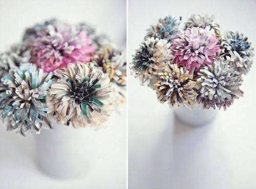 В этой статье я опишу, как сделать хризантемы из бумаги своими руками. Но они будут сделаны не просто из бумаги, а из уже прочитанных и забытых журналов, которые наверняка есть у каждой девушки. Такие поделки из старых журналов очень полезны, так как они «убивают двух зайцев» - избавляемся от стопки ненужной макулатуры и украшаем свой интерьер или праздничный стол такими необычными цветами. Сделать хризантемы совсем не сложно и увлекательно. Для создания таких цветов нам понадобится: Для создания хризантемы из бумаги, мастер класс начнем с правильного сгибания бумаги. Для этого журнальный лист А4 складываем сначала пополам, затем отгибаем каждую сторону как показано на рисунке.Таким образом, получилась гармошка. Далее ножницами начинаем делать прорези, не доходя до конца полоски гармошки, со стороны, где вышло два сгиба. Когда полоска прорезана до конца, прикрепляем деревянную шпажку на конец левой стороны бахромы с помощью бумажного скотча. И начинаем закручивать хризантему. Докру