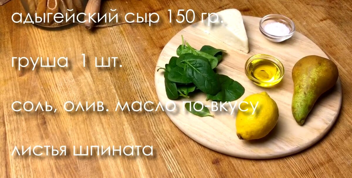 Для приготовления нам понадобится: Нарезаем грушу на 4 равные дольки. Укладываем грушу, забрызгиваем их маслом и помещаем в духовку на 15 минут, при температуре в 200 градусов. Далее нарезаем и обжариваем сыр, добавляем соль по вкусу. Далее укладываем на тарелку грушу, сверху сыр и листья шпината. Заливаем получившееся оливковым маслом и выдавливаем лимонный сок. Получился вот такой легенький и вкусный салатик, приятного вам аппетита!