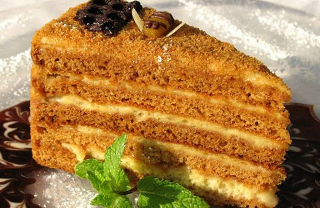 Сегодня я расскажу, как сделать данный торт Ингредиенты: 1. 125 г маргарина или масла 1. 1 стакан сахарного песка 2. 2-3 ст. л. меда 3. 1 ч. л. соды 4. 2 яйца 5. 3,5-4 стакана муки 6. Для крема:0,5 кг сметаны 15-20% 7. 1 стакан сахарного песка 1. На водяной бане растопить маргарин. 2. Добавить сахар и мед. 3. Нагревать, помешивая, до однородной массы. 4. Добавить соду и мешать до увеличения и побеления массы. Снять с водяной бани и остудить. 5. Затем добавить яйца и хорошо перемешать. 6. Добавить муку и замесить тесто. 7. Разделить на 8-10 частей. Раскатывать прямо на противне очень тонкие коржи. Сделать несколько проколов вилкой и выпекать по одному 2-3 мин. в разогретой духовке до коричневатого цвета. 8. В горячем виде обрезать края по любой подходящей форме. Выкладывать на полотенце до остывания . 9. Сметану взбить с сахаром миксером. 10. Промазывать коржи. 11. Верх медовика украсить измельченной крошкой от остатков коржей. Можно орешками и шоколадом. Приятног