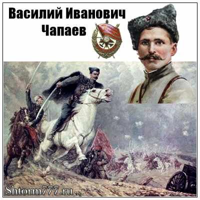 Чапаев Василий Иванович (рожд. 28 января (9 февраля) 1887 г. — 5 сентября 1919 г.) — советский военачальник, видный участник Гражданской войны. С 1918 года был командиром отряда, бригады и 25-й стрелковой дивизии, которая сыграла важную роль в разгроме войск А. В. Колчака летом 1919 г. В городе Лбищенске, был врасплох захвачен уральскими казаками, во время боя был ранен и утонул при попытке переплыть Урал.