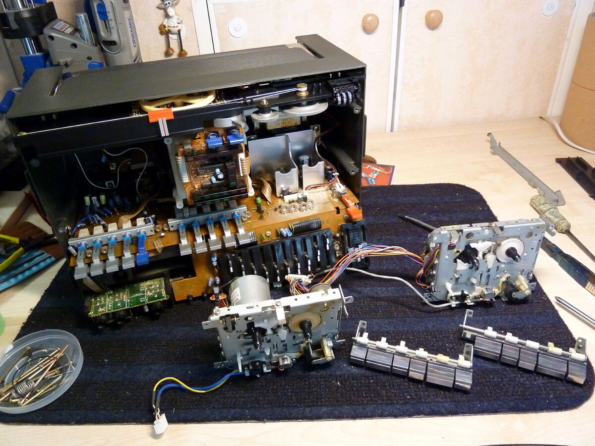 Sharp GF-800H(D). Тот самый, из 1985 года, повидавший многое на своем веку, Все ещё издающий звуки, но уже совсем не так, когда был молодым и здоровым. Для любителей "техногенных извращений",или как заставить петь "пластиковую балалайку", чуть лучше среднего. Прослушав вечером кассету,на измученном жизнью GF-800, стало совсем грустно. Звук "грязненький". Засунув хорошую лампу в кассетоприемник, стало видно , что обе головки повидали в своей жизни "фсё", и подлежат замене. Вечерком раскидал аппарат, и добрался до механизмов. В процессе разборки, откровенно порадовала отличная ремонтопригодность конструкции. Все очень здорово и легко раскидалось по блокам. Вытащенная на свет божий механика, в части головки представляет печальнейшую картинку. Износ такой,что удивительно, как она вообще могла что то воспроизводить . Бонусом "педалки" от механики отлично очистились, пока есть хороший доступ. Блестят как котика яйца. Как и предполагалось,замена изношенной японской головы, на новую,