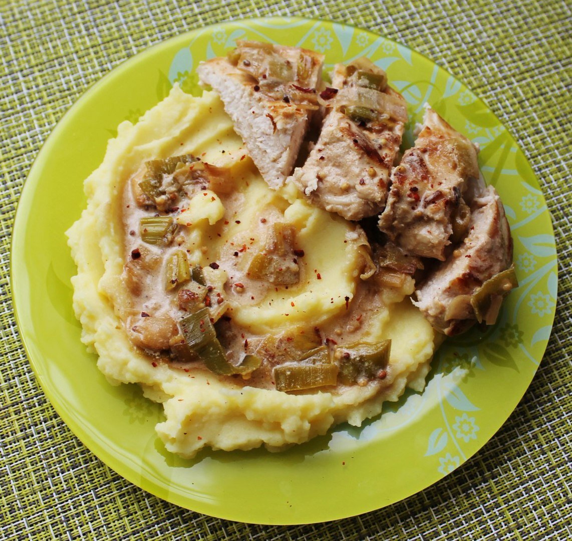 И снова рецепт от любимого повара Джейми Оливера из передачи «Обед за 30 минут». Я даже не ожидала, что получится так вкусно и быстро! Да, куриная грудка может быть очень сочной, я это давно знаю, и в этот раз вновь убедилась. Особую нежность придаёт соус с белым вином и сливками, а ещё лук-порей. О, как же я люблю лук-порей! Он такой нежный, не похожий на обычный репчатый лук, аромат и вкус, всё меня в нём подкупает. Лук-порей хорошо хранится, можно купить его и не боятся, что он испортится и смело добавлять к мясу, курице, в суп или в начинку для пирога. Попробуйте, если не пробовали, и вы обязательно в него влюбитесь. На гарнир я приготовила картофельное пюре, вместе получилось очень нежно и вкусно. Нам потребуется: Куриное филе, 2 шт. Лук-порей, ½ шт . Белое вино ½ стакана Сливки, ½ стакана (15-20%) Горчица Русская, 1 ст. л. Горчица зернистая, 1 ч. л. Чеснок, 1 зубок Соль, специи Растительное масло для жарки 1. Картофель чистим, нарезаем на четвертинки, так он сварится быстр