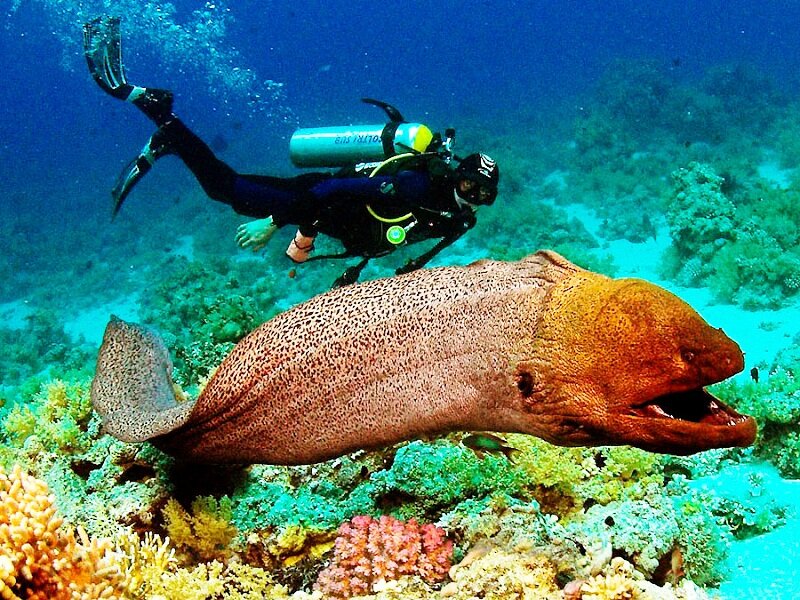 Огромная мурена напала на дайвера в Южной Африке. Инцидент произошел в бухте Содвана, сообщает www.piterburger.ru. Польский аквалангист Бартош Лукасик совершил погружение, чтобы осмотреть коралловый риф, и увидел двух мурен. На кадрах, размещенных в Сети, видно, как одна из них широко раскрыла пасть, чтобы напугать противника, а затем атаковала молодого человека. Лукасику удалось оторваться от крупной рыбы, он не пострадал. Дайвер рассказал, что не провоцировал мурен и не знает, по какой причине они на него напали. Гигантская мурена, или яванский гимноторакс — вид лучепёрых рыб из семейства муреновых (Muraenidae). Является крупнейшим и наиболее агрессивным представителем. Гигантская мурена распространена во всей тропической зоне Индо-Тихоокеанского региона: в Красном море и у берегов Восточной Африки, у Маркизских островов и у атолла Оэно (группа Питкэрн), на севере у архипелага Рюкю и у Гавайских островов, на юге до Новой Каледонии и островов Тубуаи. Как и предполагает ее название,