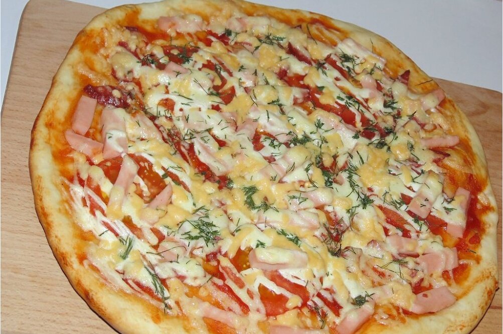 Пиццу делают и пытаются делать многие. И я в их числе. Методом проб и ошибок родился данный рецепт, которым с удовольствием делюсь с Вами! Тесто 1 стакан воды щепотка соли щепотка соды 2 ст. ложки растительного масла Мука 350-400 гр. Замешиваю тесто, и оставляю его отдыхать. Тем временем готовлю все для начинки. Я взяла 300 гр. копченой колбасы и натерла ее на крупной терке. Также можно порезать как душе угодно. Были маринованные огурчики штук где-то 6. Нарезала кружочками. Все ингредиенты я приготовила по разным чашкам, и когда пришло время собирать пиццу, все было готово и под рукой. Сыр 250 гр. также на терке. И репчатый лук 1 средняя головка, мелко нарезанный. В готовой пицце лука никто не почувствовал, ему хватило времени уготовиться. Отдельно приготовила соус для пиццы. Я не стала делать с помидорами, а смешала две ст. ложки томатной пасты, три ст. ложки майонеза, 1 чайную ложку готовой горчицы и сущеные итальянские травы по вкусу. Итак, сборка пиццы. Все тесто разделить на ч