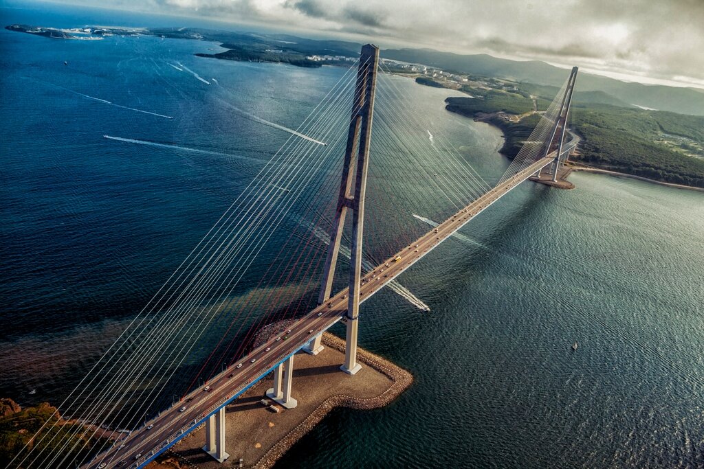 1. Мост Золотые Ворота (Сан-Франциско) Мост Золотые Ворота был самым большим висячим мостом в мире с момента открытия в 1937 году и до 1964 года. Общая длина моста — 2737 м, длина основного пролёта — 1280 м, высота опор — 227 м над водой, масса — 894 500 т. Высота проезжей части над поверхностью воды во время прилива составляет 67 м. По праву один из самых узнаваемых мостов в мире. 2. Русский мост (Владивосток) Русский мост - один из самых грандиозных в мире. Одна из причин этого в том, что длина моста во Владивостоке на острове Русский - более 3 километров. Дорожное полотно сооружения держится на диагональных тросах. Они, в свою очередь, прикреплены к двум столбам-пилонам, каждый достигает в высоту 324 метров. Все сооружение весит 23 000 тонн. Его пролеты достигают 1 километра. Русский мост во Владивостоке начали строить в сентябре 2008 года. Сооружение рассчитано на легковой транспорт и небольшие грузовые автомобили. На проезжей части четыре полосы для движения – по две в об