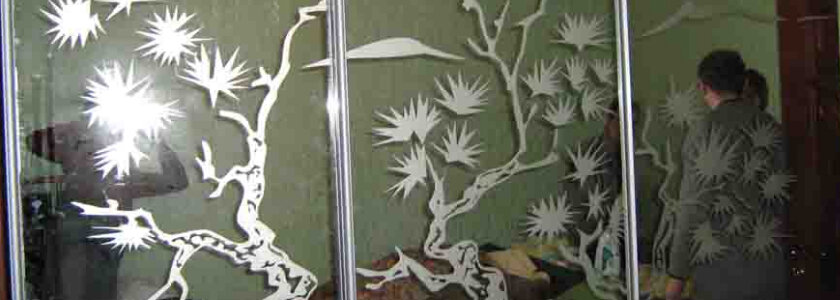 Используя трафареты из пленки, можно получить матовые рисунки любого размера и конфигурации: это могут быть надписи, узоры, логотипы и целые композиции, составляемые из нескольких трафаретов.