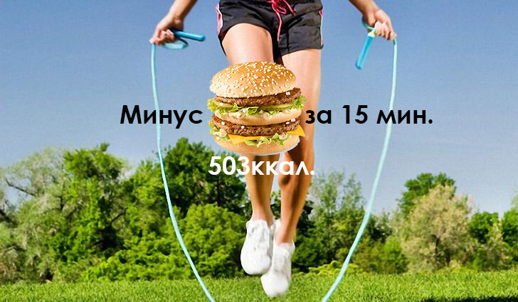 А вы знали, что 15 минут прыжков со скакалкой равнозначны 60 минутам бега Время чтения: 20 секунд Вы слышали когда нибудь?: "Если я съем 1 БИГМАК, то что бы у меня нигде не отложилось, мне нужно бегать 1 час"