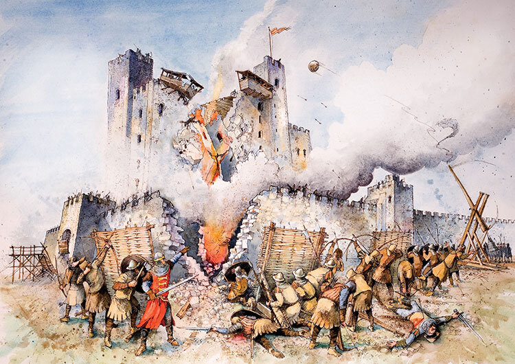 Иоанн (который на самом деле был, конечно же, Жаном или Джоном) Безземельный является наверное самым невезучим и неудачливым английским королем. Ему не везло с наследством, потом с предательствами, потом с братом, потом с владениями во Франции, которые у него оттяпывал раз за разом французский король. А еще против него постоянно бунтовали бароны, да так сильно, что Джону пришлось подписывать в июне 1215 года Великую Хартию Вольностей, с которой начался английский парламент. Правда, подписав Хартию, Джон вовсе не собирался ее выполнять. Это привело к еще большему недовольству среди баронов и те затеяли войну против своего бездарного короля. Так началась Первая Баронская война, продлившаяся до его смерти. Одним из самых значительных событий этой войны стала осада королевской армией замка в Рочестере. Город и замок взяли под свой контроль бароны, поставившие там гарнизон, в котором было около сотни рыцарей плюс арбалетчики, лучники и обычные солдаты. В октябре 1215 года к замку подош