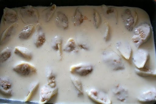 Готовые, остывшие ракушки начинить подготовленным фаршем и выложить в форму для запекания или глубокий противень.Залить соусом бешамель и запекать в хорошо разогретой духовке при 180 град. в течении 20-25 мин.Ракушки фаршированные мясом и рикоттой рекомендуется подавать с сухим белым вином.