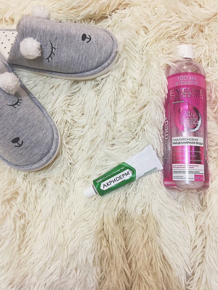 Девочки, почти у каждой из нас случается так, что на лице появляются нежелательные изъяны. Я нашла чудное средство, которое действительно работает! Короткая предыстория. Мне 23. Никогда не было проблем с кожей, никаких прыщей и красных пятен на лице. Последние пол года, меня постоянно беспокоят непонятные красные высыпания на щеках,сухость, что я только не перепробовала: дорогущие лосьоны, крема, обычный детский крем, умывалки, маски, список можно продолжать бесконечно. Я купила мицеллярную воду, после которой опять мазала лицо кремом, но ничего не помогало, каждый раз эти пятна появлялись снова. У меня гиалуроновая мицеллярная вода от Eveline cosmetics.Она снимает макияж, очищает кожу и уменьшает раздражение. Увлажняет кожу и защищает от пересушивания.Содержит пантенол, который уменьшает покраснения и снимает раздражение, обладает противовоспалительным действием. И вот по рекомендации близкого мне человека, я купила мазь "Акридерм". Он не такой дорогой, как например, "Базирон