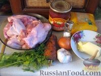 Суп «Харчо» Продукты (на 6 порций) Курица бройлерная - 1 шт. Рис - 0,5 стакана Чеснок - 1 головка Масло сливочное - 50 г Лук репчатый - 1 шт. Морковь - 1 шт. Томат-паста - 2 ст. ложки Зелень - 50-60 г Соль - 1 ст. ложка Все, что понадобится для приготовления супа харчо. Как приготовить суп харчо: