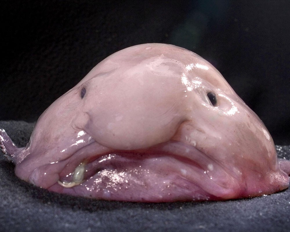 Это грустное, желеобразное существо - рыба-капля. Обитает она на глубоководье. Рыба-капля имеет на передней части головы некий отросток, который внешне похож на человеческий нос. По бокам от носа располагаются два глаза. По-длине эти рыбы не встречались более чем 30 сантиметров. У рыбы-капли нет плавательного пузыря. Он ей просто не нужен на такой большой глубине. Плавать ей позволяет желеобразное строение, которое ее поддерживает и помогает не затрачивать усилий для передвижения. К тому же у рыбы отсутствуют мускулы, питание рыбы-капли – в основном, планктон, она медленно передвигается, разинув пасть, ожидая проплывающую мимо добычу и заглатывает мелких беспозвоночных. Рыба-капля находится под угрозой исчезновения и занесена в красную книгу, как очень редкий вид.