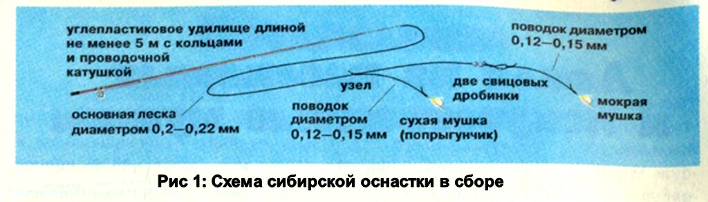 При таких обстоятельствах почти нет возможности пользоваться нахлыстовой снастью с конусным шнуром. На рис.No1 показана снасть, которая за границей неизвестна, потому как это чисто русское изобретение. Снасть достаточно простая, что независимо от рыбацкого опыта, любой может сделать уловистую оснастку для ловли на мушку из обыкновенной поплавочной удочки.
