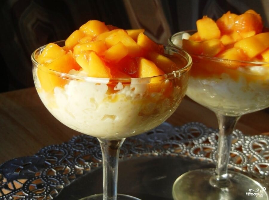 Для приготовления рисового пудинга нам потребуется: -рис круглозерный - 100 гр; -сливки - 250 мл; -сахар - 30-60 гр; -ванильный сахар или ваниль в стручке - немного по вкусу; -персики консервированные - 4 половинки; Так же можно добавить темный ром - 2 столовые ложки. Приступаем к приготовлению Первым этапом варим рис. Для этого заливаем рис молоком, добавляем ваниль. На сильном огне доводим до кипения, непрерывно помешивая. Как только молоко закипит, снижаем огонь до минимума, накрываем крышкой и варим около 40 минут, часто помешивая. Следим, чтобы рис не прилипал ко дну кастрюли После того как рис готов, добавляем в него сахар. Убираем стручок ванили. Хорошенько перемешиваем. Пудинг готов. Теперь остужаем его до комнатной температуры. Затем взбиваем 250 мл сливок до мягких пиков. По желанию добавляем ром или другой алкоголь, например, ликер амаретто. Но это совсем необязательно. Аккуратно лопаткой снизу вверх вбиваем сливки в рис. Должна получиться воздушная масса. Нарезаем пер