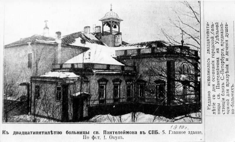 На соседней площадке, чуть севернее этой больницы, осенью 1870 года был открыт Дом призрения душевнобольных, построенный по инициативе цесаревича - будущего императора Александра III и на его собственные средства. Это был особый приют для неизлечимых помешанных из состоятельных слоев общества на 125 - 150 человек. Первоначально приют представлял собой комплекс деревянных павильонов, украшенных изящной резьбой, и церковь во имя Святого Пантелеймона, возведенных по проекту архитектора И. В. Штрома в 1870 - 1874 годах. Из них до наших дней сохранились 4 павильона и церковь, вновь действующая с 1990 года. Приют постоянно расширялся и благоустраивался. Строились новые деревянные и каменные здания. Из поздних построек особый интерес и поныне представляют так называемые пансионатные корпуса для буйных больных - небольшие каменные здания на гранитных цоколях. Корпуса были построены в 1899 - 1904 годах по проекту архитектора Г. И. Люцедарского в стиле модерн. Приют содержался преимущественно на крупные пожертвования частных лиц и, по отзывам специалистов, стал одним из первых в России разумно устроенных психиатрических заведений. В числе врачей были С. П. Боткин, В. М. Бехтерев. Попечителями в разное время были генерал-адъютант Ф. Ф. Трепов, принц А. П. Ольденбургский, и последним - великий князь Михаил Александрович. Заведение было устроено с таким расчетом, чтобы по внешнему и внутреннему расположению максимально напоминать больному домашнюю обстановку. В отдельном павильоне порой находился всего один пациент, но зато вместе с прислугой, библиотекой и врачами. При каждом павильоне в парке - аллеи, на площадках клумбы.