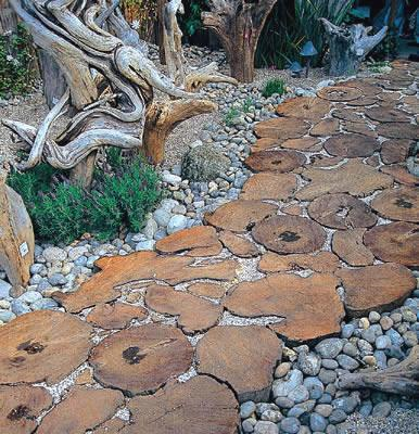 Строительство временных дорожек на период строительства дома очень актуальный вопрос для тех кто и проживает и продолжает строительство в загородном доме. С одной стороны строить капитальные дорожки не хочется потому что еще не закончены основные работы и плитка или дорожки могут повредиться. А с другой стороны не очень комфортно поскольку пыльно и грязно, особенно в весеннее и осеннее время. Поэтому рекомендую всем использовать недорогое и быстрое решение. Для этих целей мы используем срезы дерева различной конфигурации. Преимущество данного вида мощения в простоте и доступности для реализации любому желающему. Просто нарезайте отрезки древесины толщиной 30 см. Готовим основание из песка или отсева дробления щебня. Этот пункт можете пропустить если запланированный период службы дорожки менее года. Обязательно уберите кору и обработайте антисептиком. Также половину среза обработайте гидроизолирующим средством подойдет битумная эмульсия. Промежутки между срезами заполняем гранитны