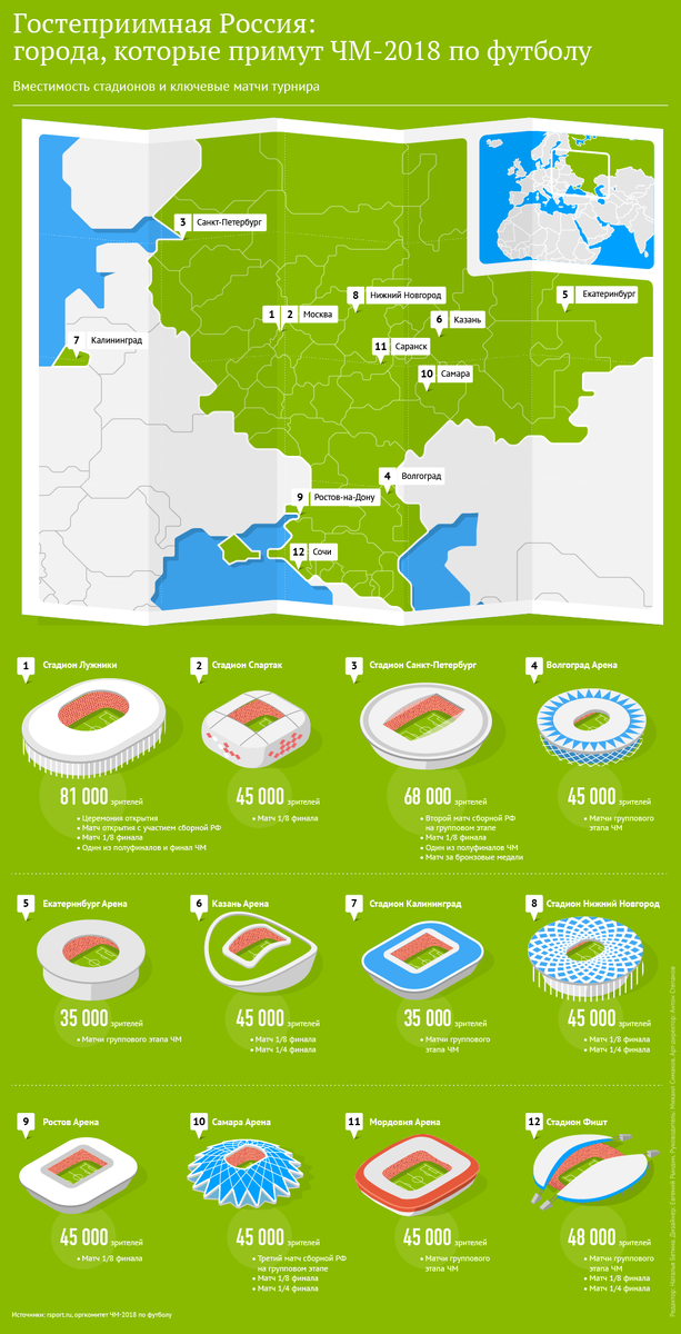 До старта одного из главных спортивных событий этого года, ЧМ по футболу, осталось всего два месяца. Напомним, что чемпионат пройдет с 14 июня по 15 июля. Принять гостей в России готовятся 11 городов (Москва, Калининград, Санкт – Петербург, Волгоград, Казань, Нижний Новгород, Самара, Саранск, Ростов – на – Дону, Сочи, Екатеринбург). Соперниками России за право проведения ЧМ по футболу 2018 были Англия, Испания – Португалия, Нидерланды – Бельгия. Однако во втором туре Россия получила больше половины голосов и одержала безоговорочную победу. Россия впервые будет страной-хозяйкой и готовится к этому событию очень основательно. На проведения данного мероприятия было затрачено $ 15 млрд. На что же были потрачены такие деньги? Этот вопрос волнует многих. Безусловно, это строительство, реконструкция и подготовка самих стадионов. Но также это и строительство ж/д, отелей, гостиниц, ресторанов, благоустройство городов, принимающих гостей и многое другое. Что уже сделано? Москва Москва стан
