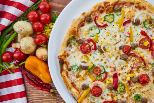 Оливковое масло, чеснок, помидоры, соль и перец. Корж пиццы смазать маслом, помидоры разрежьте на 4 части и удалить семена, выложить на тесто, затем посыпьте нарезанным чесноком, сверху потрите сыр, добавьте специи по вкусу и полейте немного маслом.