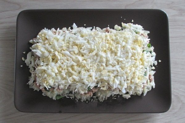 Недавно открыла для себя новый оригинальный салат. Готовится он очень просто и быстро, но в то же время невероятно вкусный. Я готовила его на праздничный стол. «Ушел» салат одним из первых, а подружки еще и рецептом просили поделиться. Для приготовления салата нам понадобится: · 4 яйца; · 200 г крабовых палочек; · 1 банка консервированного тунца; · 150 г риса; · небольшой пучок зеленого лука; · майонез. Яйца и рис необходимо отварить. Рис лучше сварить в большом количестве воды, чтобы потом была возможность его промыть, т.к. он должен быть рассыпчатым. Тунец можно взять для салата, он уже измельченный. Но можно и обычный тунец в масле просто размять вилкой. Майонез лучше использовать с высокой долей жирности. Яйца и крабовые палочки режем кубиками, мелко шинкуем зеленый лук. Первым слоем выкладываем рис, смазываем майонезом. Следующим слоем выкладываем тунец, посыпаем его зеленым луком и опять немного майонеза. Третий слой – крабовые палочки и майонез. Сверху посыпаем яйцом. За