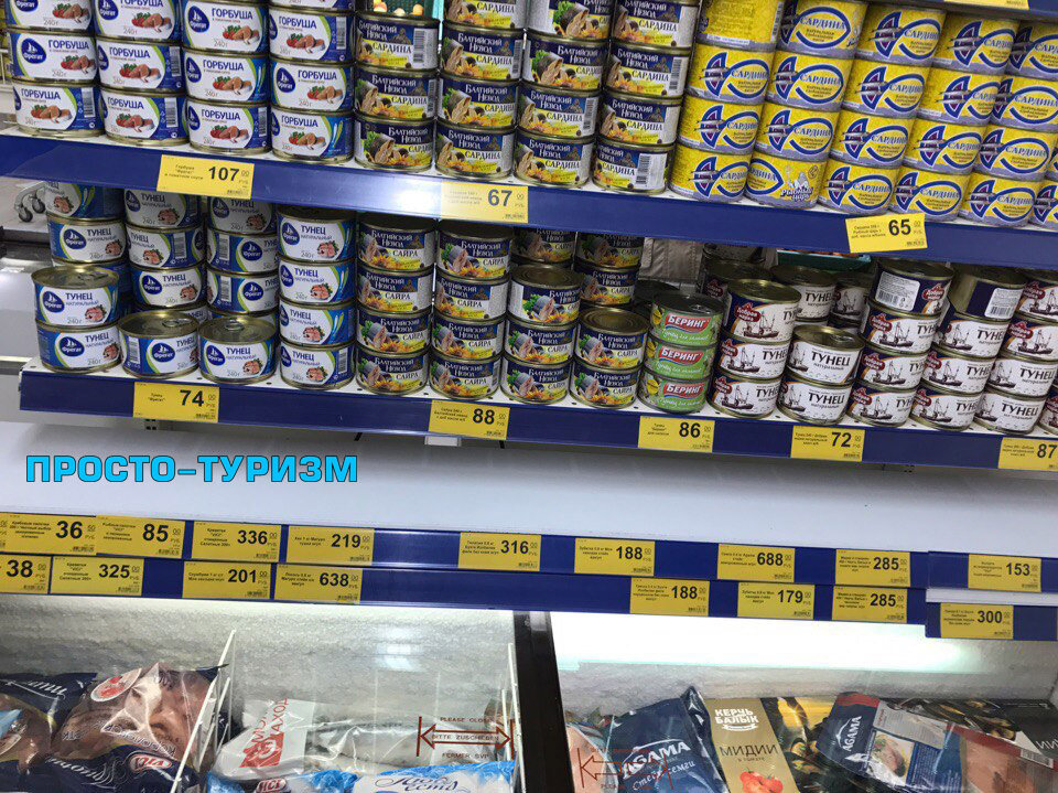 Сколько же стоят морепродукты на полуострове, расположенном в Чёрном море? Мы посмотрели цены на рыбу, морские продукты и рыбные консервы в симферопольском продуктовом супермаркете «Пуд». Морепродукты: Крабовые палочки (200 гр.) – 36,5 рубля Креветки (900 гр.) – 325-336 рублей Рыбные палочки в панировке (0,5 кг) – 85 рублей Мидии (450 гр.) – 285 рублей Ассорти из морепродуктов (400 гр.) – 153 рубля Рыба: Треска (0,7 кг.) – 300 рублей Треска (0,4 кг.) – 188 рублей Скумбрия (1 кг.) – 201 рубль Хек (1 кг.) – 219 рублей Лосось (0,5 кг.) – 638 рублей Тилапия (0,8 кг.) – 316 рублей Зубатка (0,8 кг.) – 179-188 рублей Сёмга (0,4 кг.) – 688 рублей Рыбные консервы (банка 240 гр.): Тунец – 72-87 рубля Сайра – 88 рублей Горбуша – 107 рублей Сардина – 65-67 рублей Килька – 20-45 рублей Если вам понравилась наша статья, поставьте лайк и расскажите о ней друзьям!) Тогда мы будем писать ещё больше полезных статей о жизни и путешествиях в Крыму. Не забудьте подписаться на канал Просто-Туризм (К