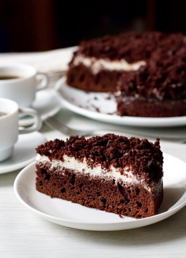 И по достоинству оценили его, потому что редко кто не любит шоколад. Вы будете без ума от него и вам захочется пробовать его снова и снова. Итак, начнем. Надо: Мука – 2 стак. Сахар – 2 стак. Разрыхлитель – 1,5 чайн.лож. Сода – 1,5 чайн.лож. 5-6 стол.лож. какао с горкой Яйцо – 2 шт. Молоко – 1 стак. Ванилин – 1 чайн. лож. Растит.масло – ½ стак. Кипящая вода – 1 стак. Крем можно выбрать на свой вкус - заварной, сметанный или на сливках. Я делаю сметанный. Для этого 0,5 кг сметаны взбиваю миксером. Чтобы крем получился густой и пышный, в сметану добавляю 2 пакетика загустителя для сливок и постепенно всыпаю сахарную пудру. Количество пудры по вкусу. Готовим тест 1.Муку просеиваем и перемешиваем с сахаром, содой, разрыхлителем и какао. 2. В глубокой миске взбиваем яйца и добавляем растительное масло. 3. К яйцам добавляем молоко, ванилин и смесь муки, постепенно размешивая каждую порцию. 4. В полученное тесто влить стакан крутого кипятка. Тесто сразу станет жидким. Хорошо перемешать. 5.