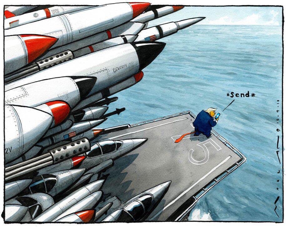 14 апреля 2018 года США и её союзники осуществили массовый ракетный удар по территории Сирии в ответ на подозрение в использовании химического оружия против оппонентов в городе Дума. Здесь представлена подборка карикатур зарубежных СМИ на данное событие.