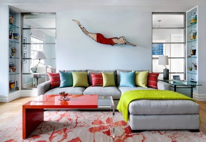 Не стоит забывать и о контрастах: в помещения, где базовыми цветами являются зеленый или синий, удачно впишутся желтые или оранжевые акценты, а в скандинавский белый интерьер – черные или холодные синие.
