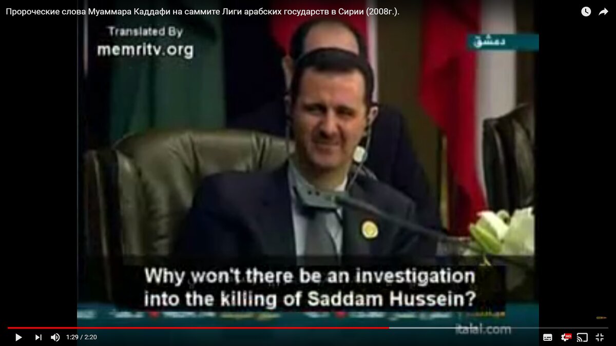 Так по какой же причине вторглись и разрушили Ирак, убив миллион иракцев? Пусть наши американские друзья ответят вот на какой вопрос: почему Ирак? за что? Бин Ладен – иракец? Нет. Теракт в Нью-Йорке совершили иракцы? Нет, не они. Пентагон атаковали иракцы? Нет, не они. Было ли оружие массового поражения в Ираке? Нет, не было. Да даже если и было – то у Пакистана есть это оружие, и у Индии, и у Китая, и у Франции, и у России, и у Британии, и у США. У них у всех есть атомные бомбы. Что, их тоже уничтожать будем? Хорошо, давайте развалим все страны, где оно есть. Иностранная держава оккупируют арабское государство и вешает его президента, а мы тут в стороне сидим и смеемся. Почему не проводится расследование казни Саддама Хуссейна? Как можно повесить военнопленного, президента арабской страны и ни много, ни мало – страны-члена ЛАГ? Сейчас нет речи о политике, которую проводил Саддам Хуссейн, или о наших с ним разногласиях. У всех у нас были с ним политические разногласия с ним, равн