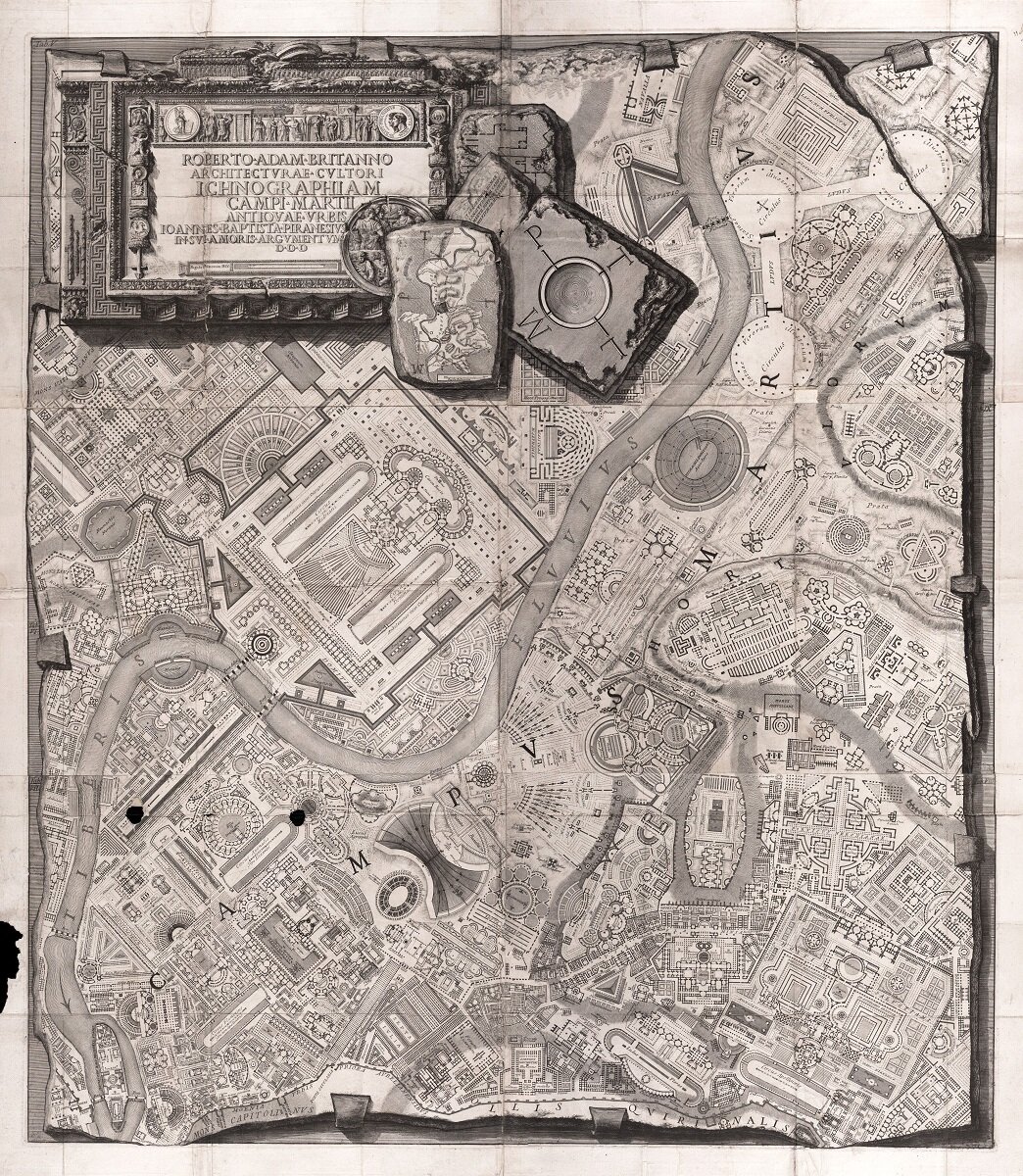 В древности Марсово поле (часть Рима между современной Виа дель Корсо и руслом реки Тибр) являлось ядром города. На его территории находились императорские форумы - форум Августа и Траяна, въездные ворота в город, мавзолеи, мосты для триумфальных шествий, театры. Благодаря изучению древних авторов, в частности известного греческого географа Страбона, Пиранези осознавал необходимость и серьезность исследования этой части Рима. Страбон писал о Марсовом поле: