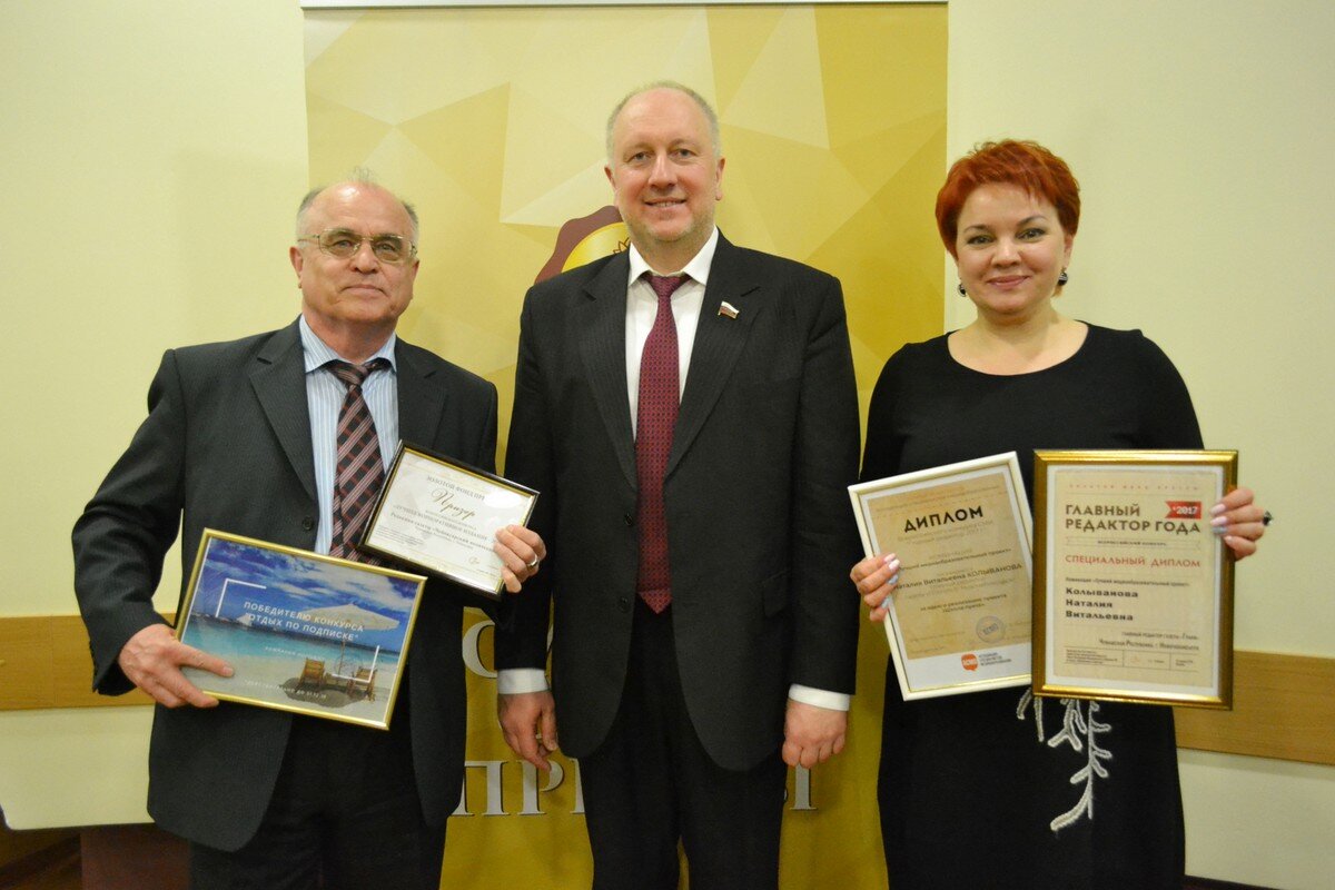 Сразу с несколькими дипломами за победу во всероссийских конкурсах вернулась с ежегодного VIII делового форума российских СМИ “Качественная пресса и перспективы ее развития”, проходившего в Москве, главный редактор “Граней” Наталия Колыванова. На фото. Бывший главный редактор газеты “Путь к коммунизму” Николай Галкин (слева) получил награду как руководитель корпоративного издания чебоксарского вуза. Наталия Колыванова (справа) привезла с форума два диплома. В центре — вручавший награды Сергей Рыбаков, председатель оргкомитета “Золотого фонда прессы”, заместитель председателя комитета Совета Федерации РФ по науке, образованию и культуре. Во Всероссийском конкурсе “Главный редактор года” Наталия Колыванова и коллектив возглавляемых ею “Граней” стали победителем в номинации “Эффективное развитие альтернативной службы подписки”. Ей вручили специальный диплом Союза издателей ГИПП (гильдия издателей периодической печати).