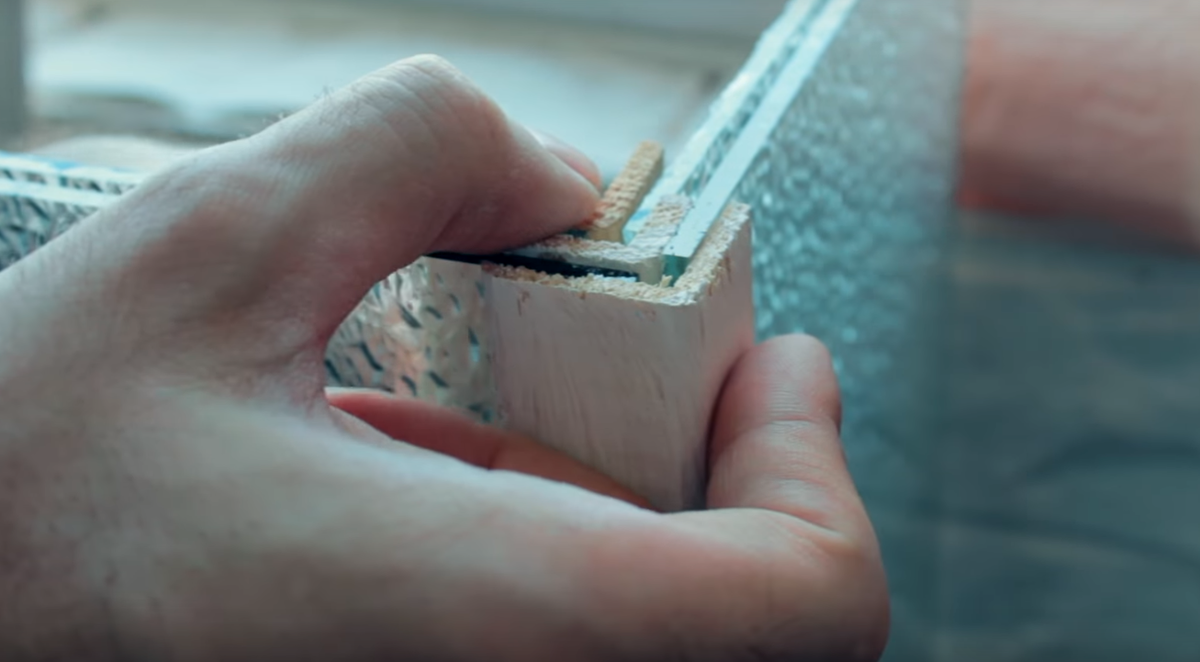 Стекла Изготовление начинаем с того что под нужный размер нарезаем наружный угол и стекла. Собираем их следующим образом. Низ нашей конструкции задуваем герметиком Далее на низ нашей конструкции ложем столешницу предварительно сделав в ней два отверстия, под шпильку и одно побольше, следом оббиваем её плинтусом. Засыпаем мраморную крошку в пространство между стеклами. Следом на