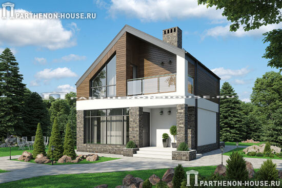 Небольшой компактный дом с мансардой. Дом имеет красивые современные фасады благодаря большим окнам и оригинальной отделке. Архитектурный стиль - модерн.