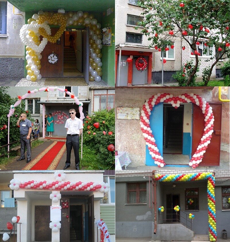Выкуп – интересная свадебная традиция, которая уходит корнями в глубокое прошлое. Тернистый путь жениха к своей любимой часто начинается с подъезда многоэтажки: к сожалению, обшарпанные и расписанные стены выглядят далеко не празднично, поэтому вопрос декорирования актуален как никогда. Как украсить подъезд перед проведением выкупа? – давайте разбираться. Украшение входа в подъезд на свадьбу Угрюмая и неприятная металлическая дверь хорошего настроения никому не прибавит, нередко ее украшают нелицеприятные надписи и странные картины дворовых художников, так что ваша задача – привести вход в божеский вид. Самый простой способ – воздушные шары, из них можно сделать замысловатые композиции или просто развесить в хаотичном порядке. Рекомендуется использовать не более 3 цветов. Другое дело – праздничные плакаты и бумажные аппликации. Дешево и сердито. Это могут быть и растительные орнаменты, и веселые коллажи, и фотожабы, и кодекс правил для жениха, и стихи-пожелания. Можно использовать и