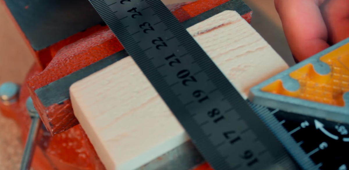Металлическая линейка На одном из брусков делаем отметку по ширине линейки при этом не забываем выдерживать угол 90 градусов Теперь аккуратно выбираем это места стамеской в идеале это сделать фрезой, но у меня её к сожалению нет. Во втором куске бруска делаем в центре отверстие сверло на 12 и нарезаем резьбу мечиком М14 Затем склеиваем наши бруски между собой, вставляем линейку и зажимаем её болтом