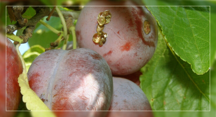 Почему слива «плачет»? На стволах и плодах деревьев иногда появляется янтарный наплыв – камедь. На самом деле это тревожный симптом болезни, которая в последствии может погубить дерево. От камедетечения чаще страдают вишни и сливы, особенно те, что растут на кислой и тяжелой глинистой почве. Камедь выделяется из трещин и ран на стволах, скелетных ветвях и плодах. Причины могут быть разные: механическое повреждение стволов и веток деревьев, солнечные ожоги, подмерзание растений или резкие изменения температуры весной и осенью, поражение болезнями и вредителями. Что делать при каседетечении Если видите янтарные наплывы на деревьях, зачистите раны садовым ножом до здоровой ткани (плюс еще 4-5 мм), продезинфицируйте раствором медного купороса (100 г на 10 л воды) и замажьте садовым варом. Можно еще делать так: натереть рану свежими листьями щавеля, подождать, когда подсохнет, и повторить 1 -2 раза. Затем нанести садовую замазку. Повреждение побегов и листьев сосущими насекомыми (в основном