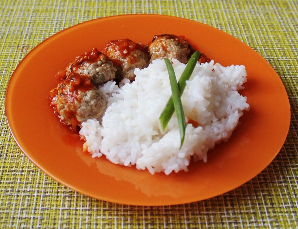Готовим одновременно гарнир, мясо и соус. Мясные фрикадельки в духовке – это вкусно, быстро и полезно. Соус сделаем отдельно, с томатами и болгарским перцем. Если любите острое, то можно в соус добавить острый чили перец. Добавляйте каждый раз разные специи и травы и будут разные вкусы, сегодня у меня с любимым базиликом. Фрикадельки можно поджарить на сковороде, это будет ещё быстрее, но в духовке не менее вкусно и точно полезнее. Нам потребуется для фрикаделек: Мясной фарш Репчатый лук Белый батон Яйцо Соль, специи, зелень Для соуса: Помидоры (можно замороженные или консервированные в собственном соку) Репчатый лук Болгарский перец Чеснок Соль, сахар, специи, зелень Гарнир: Рис Растительное масло 1. Включаем разогреваться духовку. 2. Ставим вариться рис. Рис промоем и слегка обжарим на небольшом количестве растительного масла, зальём кипятком, убавим огонь на минимум и не открываем до готовности. 3. Приготовим фрикадельки. Белый батон замочим в воде. В фарш натрём репчатый лук,