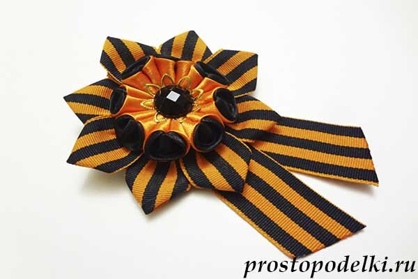 Георгиевская памятная ленточка – это популярный атрибут мая. Этот самый цветущий месяц в году у всех ассоциируется с великой Победой, с сединами скромных ветеранов, которые сделали для нашего и последующих поколений неоценимый подвиг. Чтобы чествовать тех, кто еще жив, чтобы почтить память тех, кого уже нет с нами, мы шествуем на Параде, принимаем участие в акции Бессмертный полк. И георгиевская ленточка – это тонкая нить, которая сплачивает людей будущего и прошлого, целые поколения. В этом мастер-классе рассказано, как сделать нарядную георгиевскую ленту с hand-made цветком канзаши. Аксессуар получится красивым и впечатляющим. Для декорирования броши следует подготовить черно-оранжевую зефирку и овальные остроконечные лепестки. Для изготовления броши канзаши понадобится: Как сделать брошь к 9 мая поэтапно: Нижний слой цветка будет выполнен из остроконечных лепестков, на изготовление которых уйдет георгиевская (репсовая) ленточка размером 2,5 см на 7 см. Чтобы сделать все лепестки с